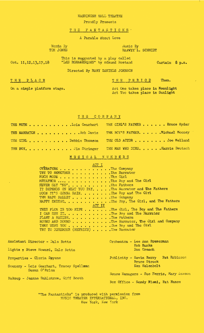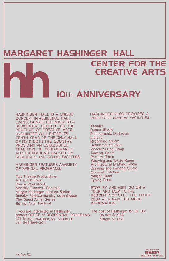 Fall,'73 | Hashinger presents a variety show, "Maggie's Mobile Medicinal Marvel," as a Parents' Day activity, and it tours to other residence and scholarship halls. Hashie Rick Pittaway writes about it in the Association of University Residence Halls Interchange, a newsletter (Hashie Bruce Ryder is associate editor). | |